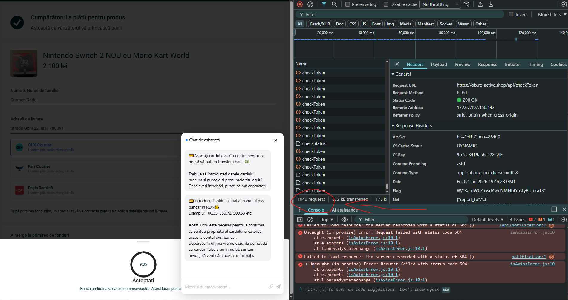 Now here comes an interesing part. I've been monitoring what requests the page is sending out throughout all this back and forth, and the page began sending hundreds of "checkToken" requests to a cloudflare backend. (There were periodic requests sent before this too, "ping" and "MessageGet" requests but those didn't seem that interesting, they just retrieved the messages in the chat window.)